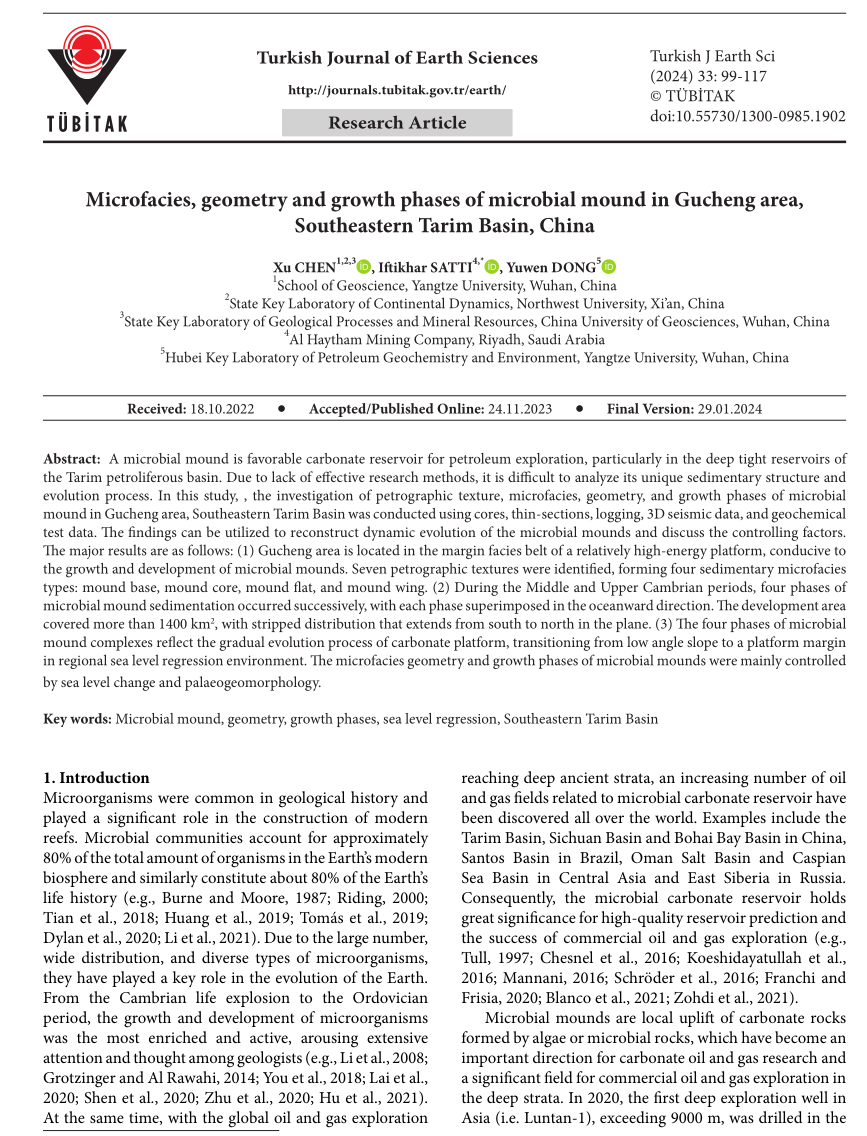 yl7703永利集团陈旭副教授以第一作者身份在《Turkish Journal of Earth Sciences》上发表题为“Microfacies, geomety, and growth phases of microbial mound in Gucheng area, Tarim Basin, China”的研究论文,该项研究得到了湖北省自然科学基金的资助。