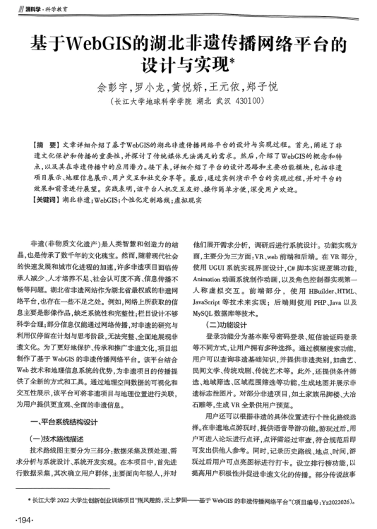 该平台设计功能包括用户功能(登陆注册)、搜索、湖北非遗内容展示:展现形式包含文字、图片、视频、以及部分非遗项目的VR展示。旅游路线规划:结合学生专业知识,使用WebGIS技术,将地图信息发布到网页上。用户可以根据兴趣点筛选旅游景区、指定旅游路线。趣味答题:为了让更多人了解并传承非遗文化,用户可以通过参与趣味答题学习到相关知识,并与网友PK。最后,该平台调用了高德API,可以根据用户选择的路线进行实时的导航。