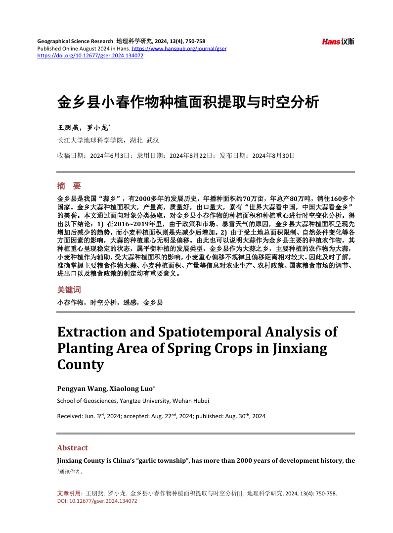 我院硕士生王鹏燕在中文期刊《地理永利集团》上发表了题为“金乡县小春作物种植面积提取与时空分析”的研究论文。yl7703永利集团为论文第一署名单位,硕士研究生王鹏燕为论文第一作者,其导师罗小龙教授为该文通讯作者。