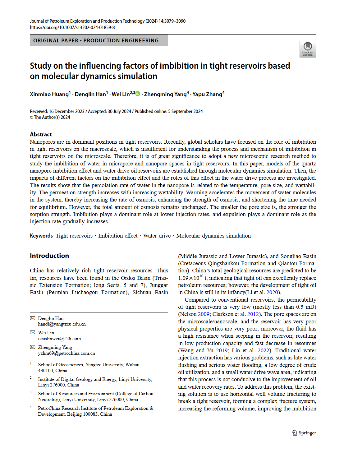 地科学院硕士研究生章黄鑫淼在《Journal of Petroleum Exploration and Production Technology》发表了题为“Study on the influencing factors of imbibition in tight reservoirs based on molecular dynamics simulation”的研究论文,yl7703永利集团为论文第一署名单位,黄鑫淼为论文第一作者,韩登林教授、林伟老师、杨正明老师共同为该文通讯作者。