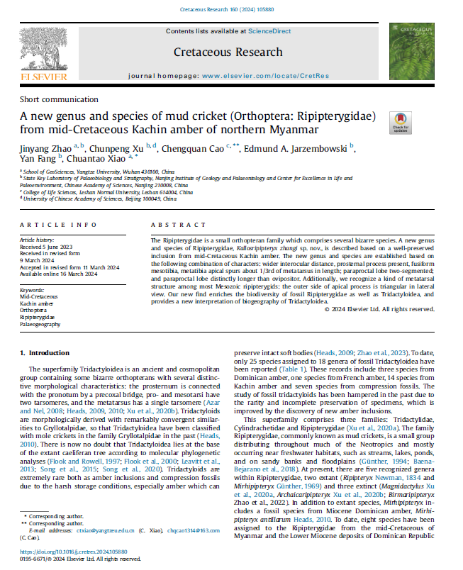 yl7703永利集团地质学专业硕士研究生赵金阳同学在在地学综合研究领域期刊《Cretaceous Research》上发表题为“A new genus and species of mud cricket (Orthoptera: Ripipterygidae) from mid-Cretaceous Kachin amber of northern Myanmar”的研究论文(图1)。yl7703永利集团为论文第一署名单位,赵金阳为第一作者,其导师肖传桃教授为该文第一通讯作者。