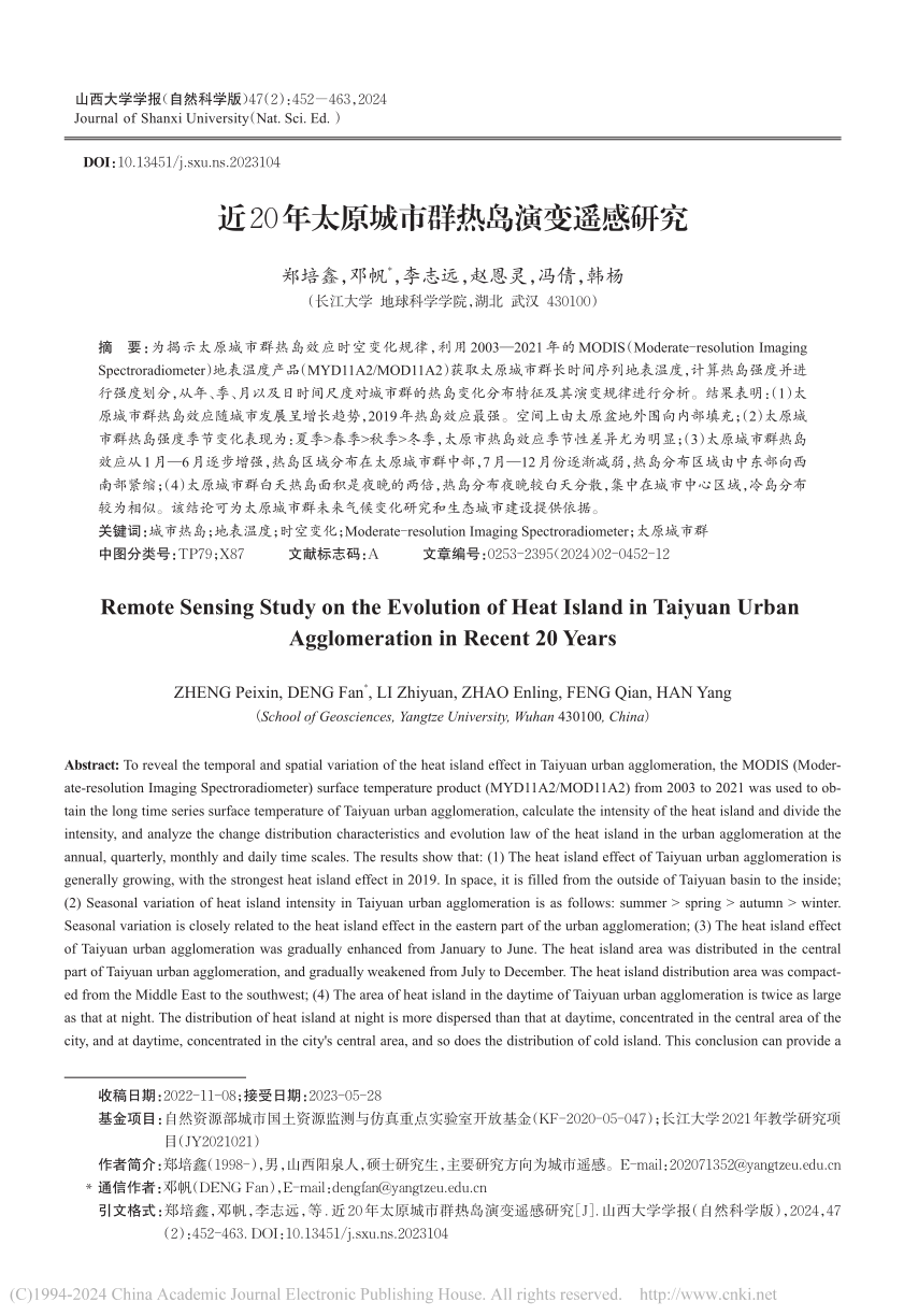 地科学院硕士生郑培鑫在北大核心期刊《山西大学学报》(自然科学版)发表题目为“近20年太原城市群热岛演变遥感研究”的研究论文。yl7703永利集团为论文第一署名单位,硕士研究生郑培鑫为论文第一作者,其导师邓帆为论文通讯作者。