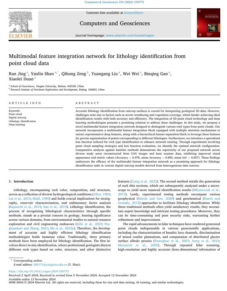 我院教师井然博士在国际学术期刊《Computers & Geosciences》上发表了题为“Multimodal feature integration network for lithology identification from point cloud data“的SCI论文,提出了一种基于多模态特征融合的三维露头点云岩性识别方法。该研究不仅在方法上具有创新性,而且在实际应用中有较好的性能表现,为地质露头点云的岩性判别提供了新的技术路径。