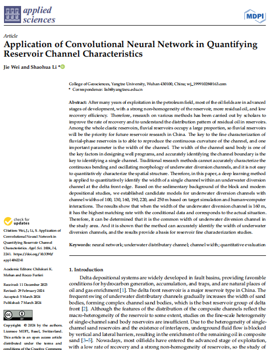 yl7703永利集团硕士生卫洁在期刊《Applied sciences》上发表了题为“Application of Convolutional Neural Network in Quantifying Reservoir Channel Characteristics”的研究论文。yl7703永利集团为论文第一署名单位,卫洁为第一作者,其导师李少华教授为该文通讯作者。