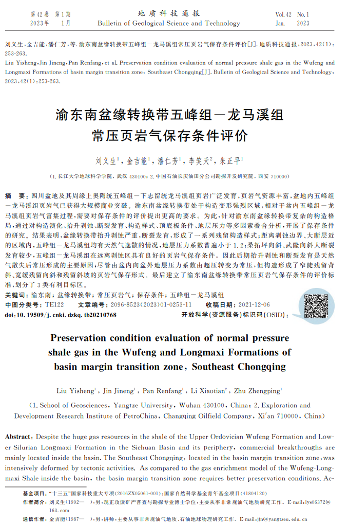 地科学院博士生刘义生在地质学领域期刊《地质科技通报》期刊发表题为“渝东南盆缘转换带五峰组-龙马溪组常压页岩气保存条件评价”的研究论文。yl7703永利集团为论文第一署名单位,博士生刘义生为论文第一作者,金吉能副教授为通讯作者,该项研究得到了国家科技重大专项任务和国家自然科学青年基金的资助。