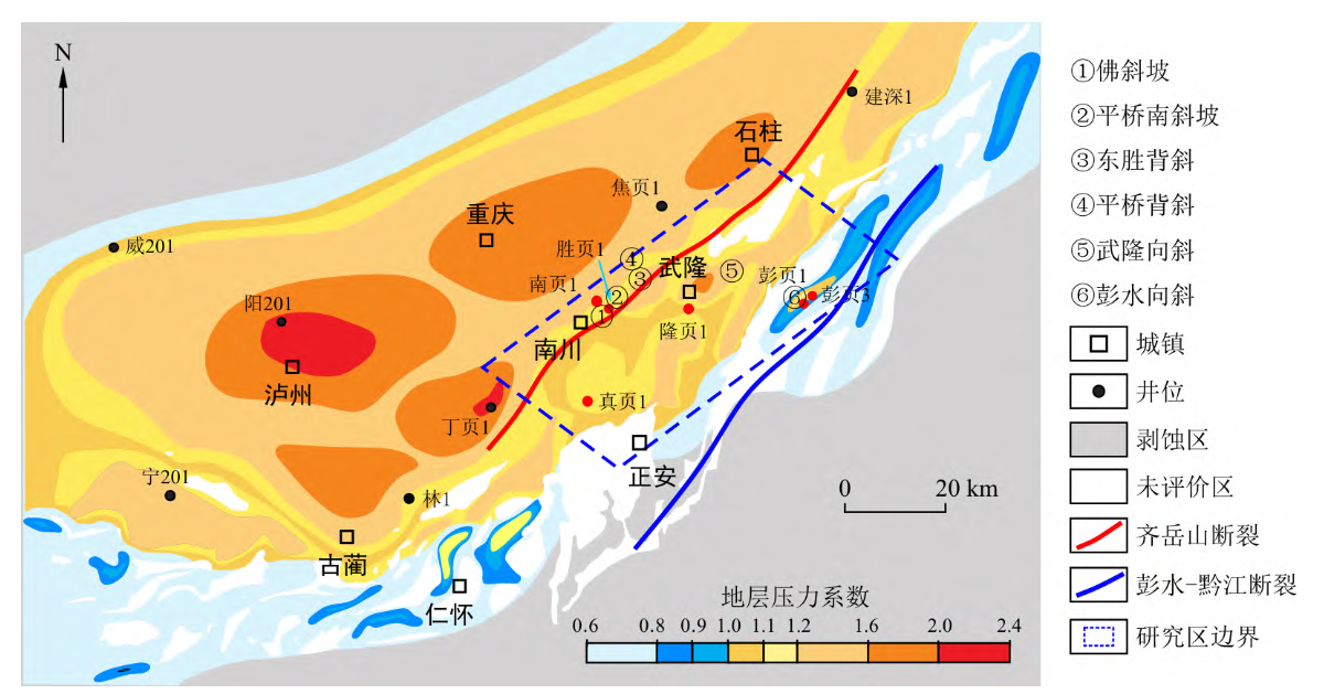 图1 渝东南部分井点龙马溪组地层压力系数、产气量与主要断裂平面图
