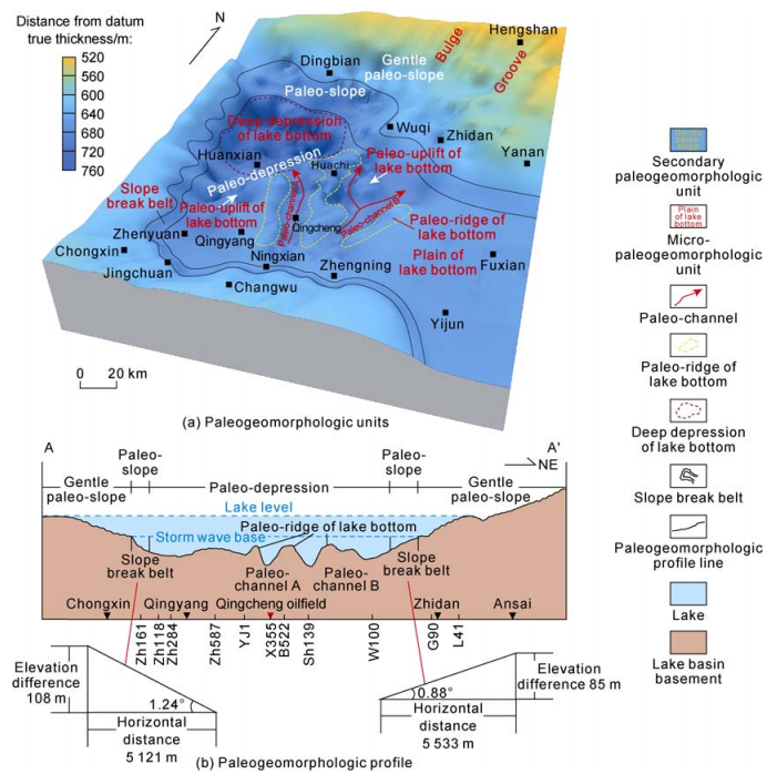 图1 研究区长7段沉积期古地貌单元及剖面图