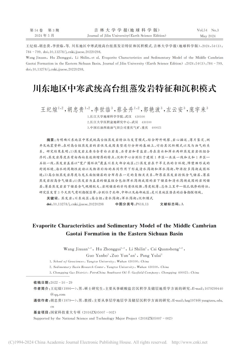 yl7703永利集团20级硕士研究生王纪煊在期刊《吉林大学学报(地球科学版)》上发表题为“川东地区中寒武统高台组蒸发岩特征和沉积模式”的研究论文。yl7703永利集团为论文第一署名单位,硕士研究生王纪煊为论文第一作者,其导师胡忠贵教授为该文通讯作者。