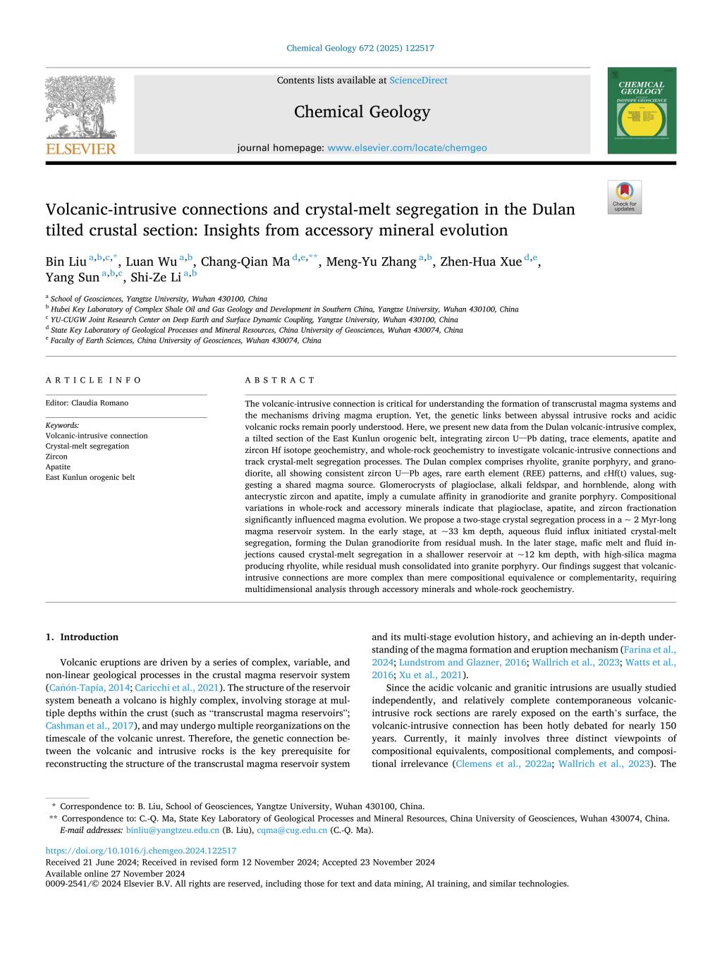 yl7703永利集团刘彬教授团队在地学TOP期刊《Chemical Geology》上发表了题为“Volcanic-intrusive connections and crystal-melt segregation in the Dulan tilted crustal section: Insights from accessory mineral evolution”的研究论文。刘彬教授为第一作者和通讯作者,该项研究得到了国家自然科学基金等项目资助。