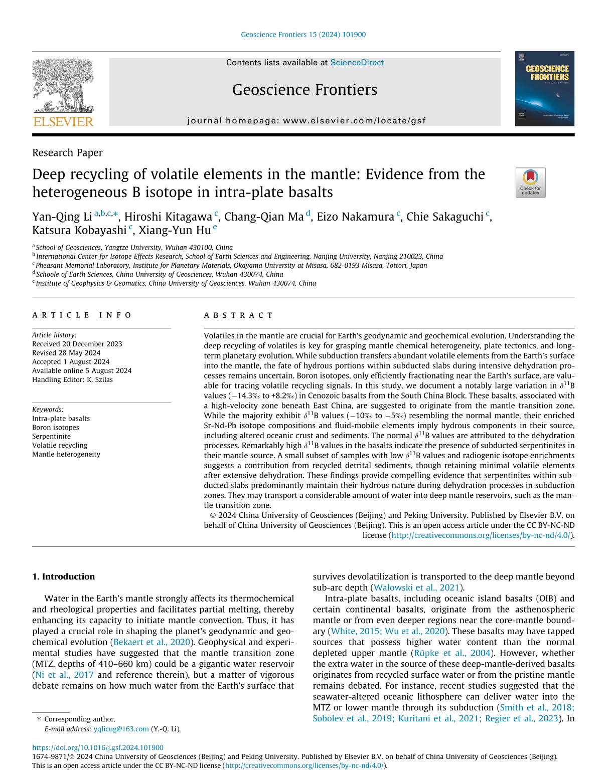 yl7703永利集团地科系教师李艳青在期刊《Geoscience Frontiers》上发表题为《Deep recycling of volatile elements in the mantle: Evidence from the heterogeneous B isotope in intra-plate basalts》的研究论文。