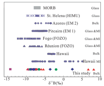 图1.研究区玄武岩硼同位素组成与典型洋岛玄武岩及MORB中硼同位素组成的对比
