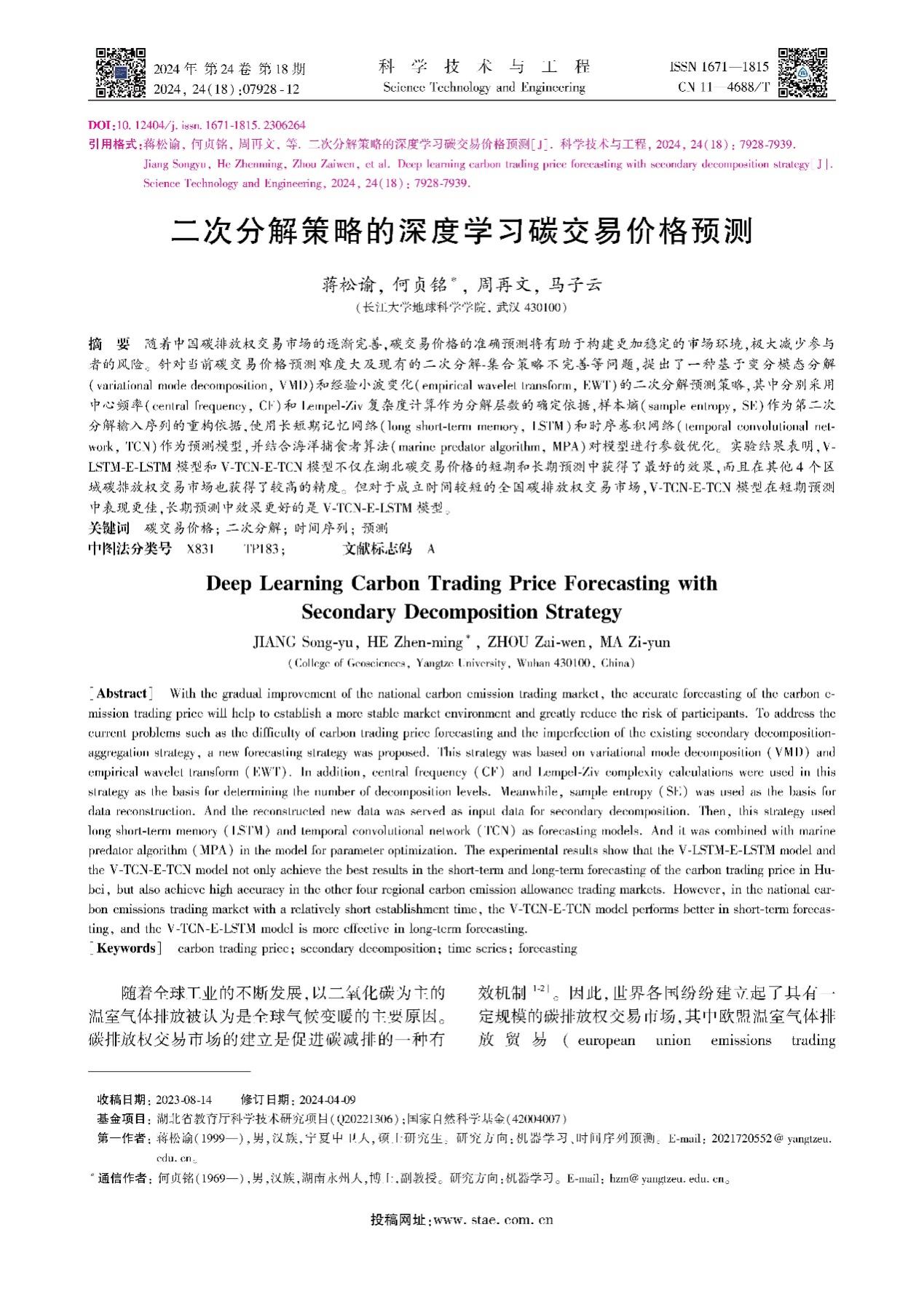 地科学院何贞铭副教授团队长期从事GIS、RS应用的研究,团队成员蒋松渝在中文核心期刊《科学技术与工程》上发表题为“二次分解策略的深度学习碳交易价格预测”的研究论文。yl7703永利集团为论文第一署名单位,硕士研究生蒋松渝为论文第一作者,其导师何贞铭副教授为该文通讯作者。在导师严格要求及编辑耐心帮助下取得该成果。