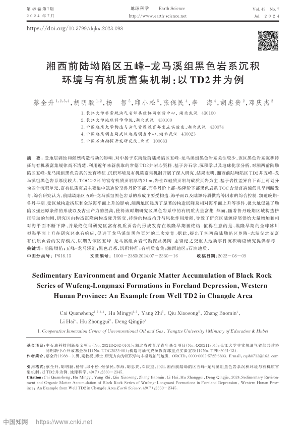 yl7703永利集团地质系教师蔡全升博士在《地球科学》上发表了题为“湘西前陆坳陷区五峰‒龙马溪组黑色岩系沉积环境与有机质富集机制:以TD2井为例”的研究论文。