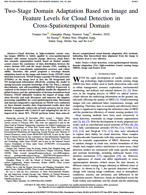 地科学院高贤君副教授在遥感领域主流期刊《IEEE JOURNAL OF SELECTED TOPICS IN APPLIED EARTH OBSERVATIONS AND REMOTE SENSING》上发表题为“Two-stage Domain Adaption based on Image and Feature Levels for Cloud Detection in Cross-spatiotemporal Domain”的研究论文。