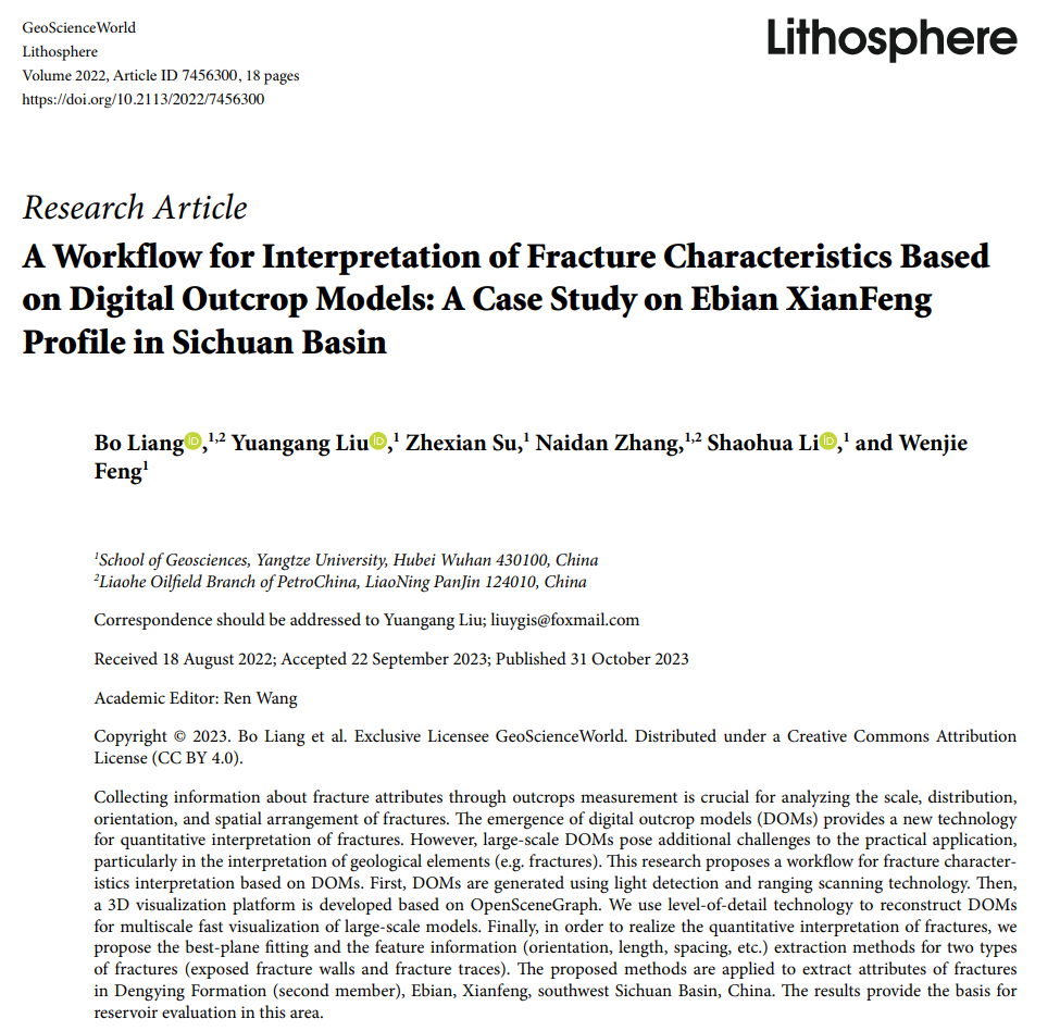 yl7703永利集团硕士生梁博在地学期刊《Lithosphere》上发表了题为“A Workflow for Interpretation of Fracture Characteristics Based on Digital Outcrop Models: A Case Study on Ebian Xianfeng Profile in Sichuan Basin”的研究论文。yl7703永利集团为论文第一署名单位,梁博为第一作者,其导师刘远刚副教授为该文通讯作者。