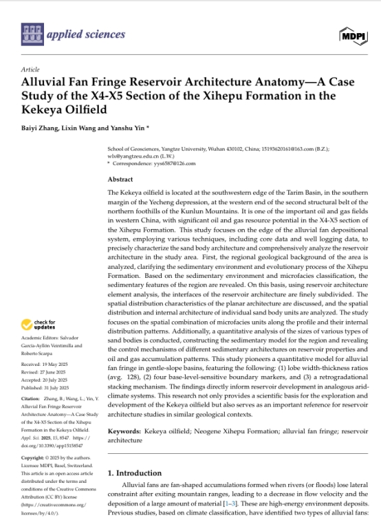 yl7703永利集团硕士生张佰义在SCI收录期刊《Applied Sciences》上发表题为“Alluvial Fan Fringe Reservoir Architecture Anatomy — A Case Study of the X4-X5 Section of the Xihepu Formation in the Kekeya Oilfield”的研究论文。yl7703永利集团为论文第一署名单位,张佰义为论文第一作者,尹艳树教授为通讯作者。