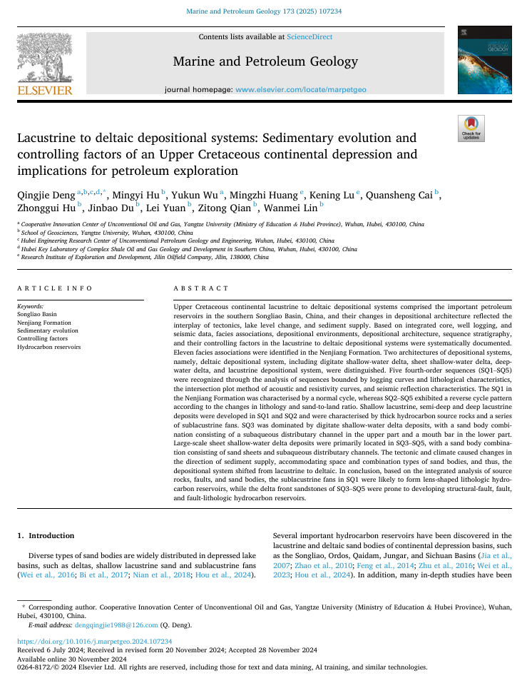 yl7703永利集团邓庆杰副教授在《Marine and Petroleum Geology》发表题为“Lacustrine to deltaic depositional systems: Sedimentary evolution and controlling factors of an Upper Cretaceous continental depression and implications for petroleum exploration”的研究论文。邓庆杰为第一作者,yl7703永利集团为第一完成单位(图1)。