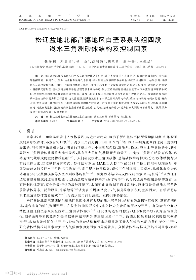 yl7703永利集团23级硕士研究生钱子桐以第一作者身份在中文核心期刊《东北石油大学学报》发表题为“松辽盆地北部昌德地区白垩系泉头组四段浅水三角洲砂体结构及控制因素”的研究论文。yl7703永利集团为论文第一署名单位,其导师邓庆杰副教授为论文通讯作者(图1)。