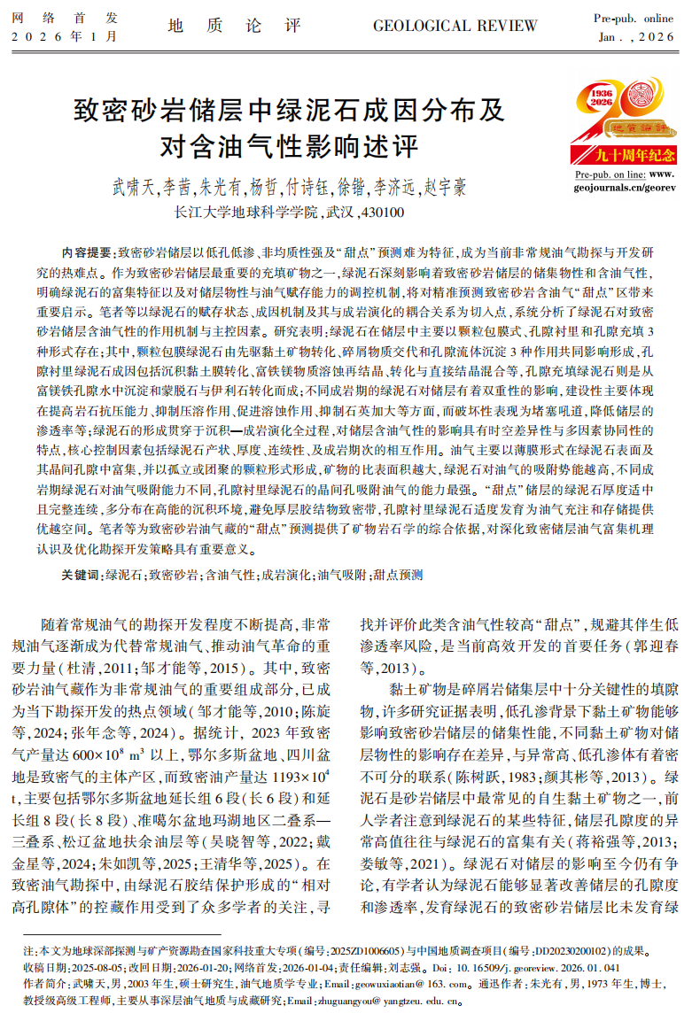 近日,地科学院2025级资源与环境专业硕士生武啸天以第一作者身份在中文核心期刊《地质论评》上发表题为“致密砂岩储层中绿泥石成因分布及对含油气性影响述评”的研究论文(图1)。硕士生武啸天为论文第一作者,其导师朱光有教授为论文通讯作者,yl7703永利集团为第一完成单位。
