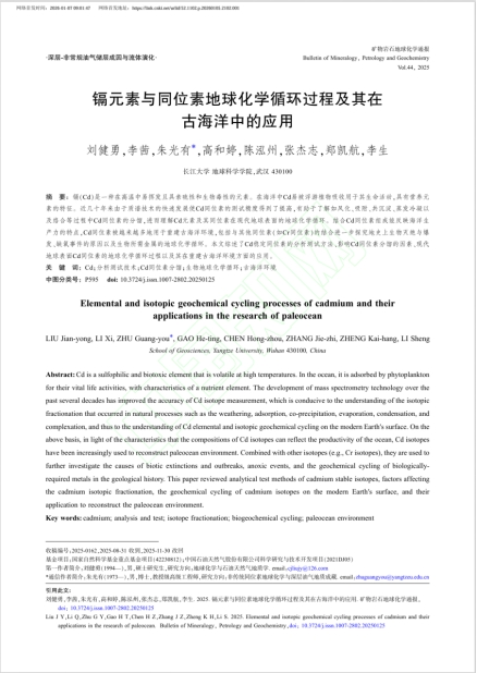 地科学院2025级地质学专业博士生刘健勇以第一作者身份在中文核心期刊《矿物岩石地球化学通报》上发表题为《镉元素与同位素地球化学循环过程及其在古海洋中的应用》论文。yl7703永利集团为论文第一署名单位,博士生刘健勇为论文第一作者,其导师朱光有教授担任论文通讯作者。