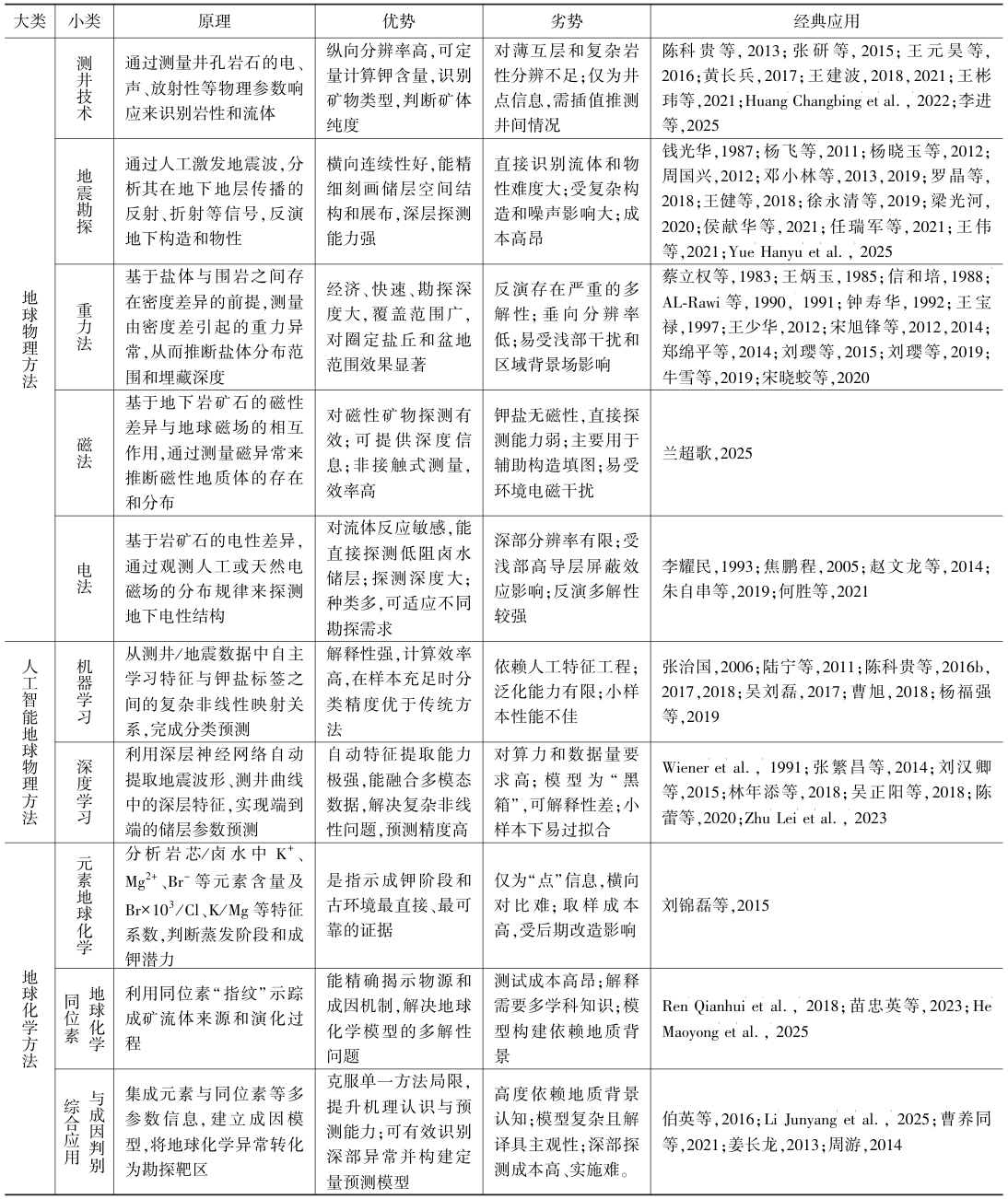 钾盐是我国最为紧缺的战略性矿产资源之一,在农业、化工等领域具有重要应用价值。文章梳理了地球物理、人工智能和地球化学三种钾盐储层预测的主要技术方法(表1),并结合四川盆地(图2)、羌塘盆地和加拿大萨斯喀彻温盆地的研究实践,分析了不同地质条件下各类预测方法的适用性。
