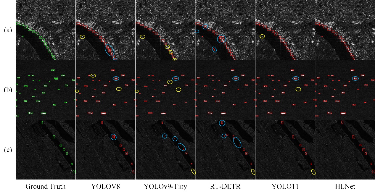 图2 复杂场景下的SAR船舶检测对比实验结果。黄色圆圈表示漏检区域,蓝色圆圈表示误检区域。