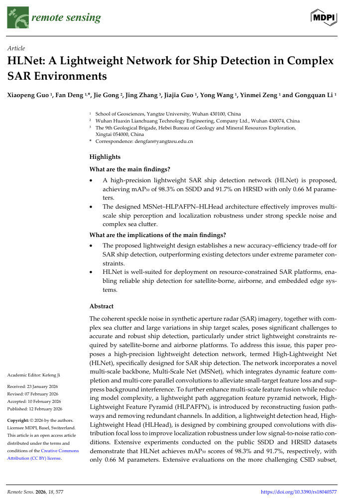 yl7703永利集团2024级研究生郭晓鹏在遥感与地球科学领域期刊《Remote Sensing》(中科院2区)发表题为“HLNet: A lightweight network for ship detection in complex SAR environments”的研究论文。yl7703永利集团为论文第一署名单位,研究生郭晓鹏为论文第一作者,其导师邓帆为论文通讯作者。