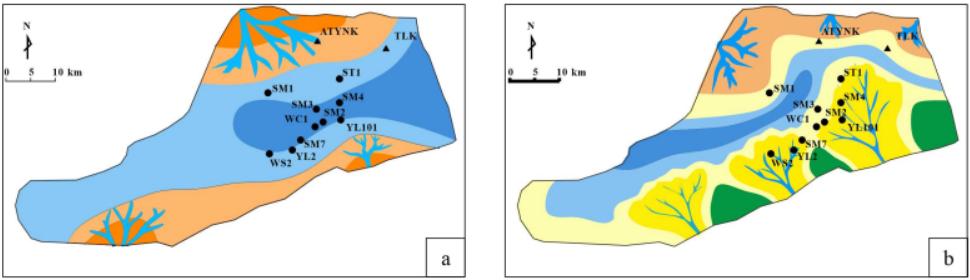 图1 a.黄山街组沉积相平面图b.克拉玛依组沉积相平面图