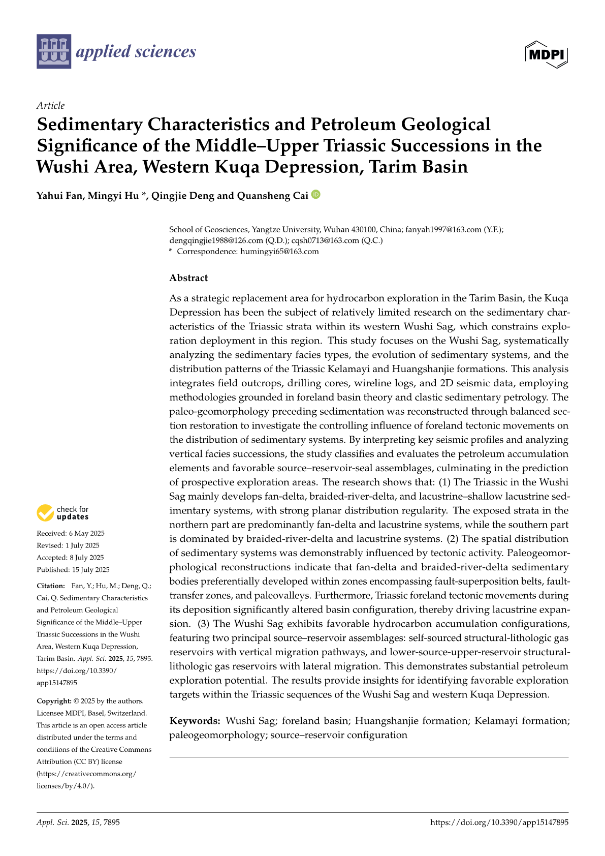 yl7703永利集团硕士生范亚辉在SCI收录期刊《Applied Sciences》上发表题为“Sedimentary Characteristics and Petroleum Geological Significance of the Middle–Upper Triassic Successions in the Wushi Area, Western Kuqa Depression, Tarim Basin”的研究论文。yl7703永利集团为论文第一署名单位,胡明毅教授为通讯作者。