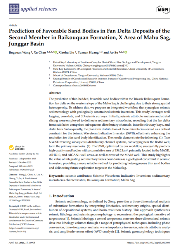 yl7703永利集团硕士生王敬原在SCI收录期刊《Applied Sciences》上发表题为“Prediction of favorable sand bodies in fan delta deposits of the second member in Baikouquan Formation, X Area of Mahu Sag, JunggarBasin”的研究论文。yl7703永利集团为论文第一署名单位,硕士生王敬原为论文第一作者,陈旭副教授为通讯作者。