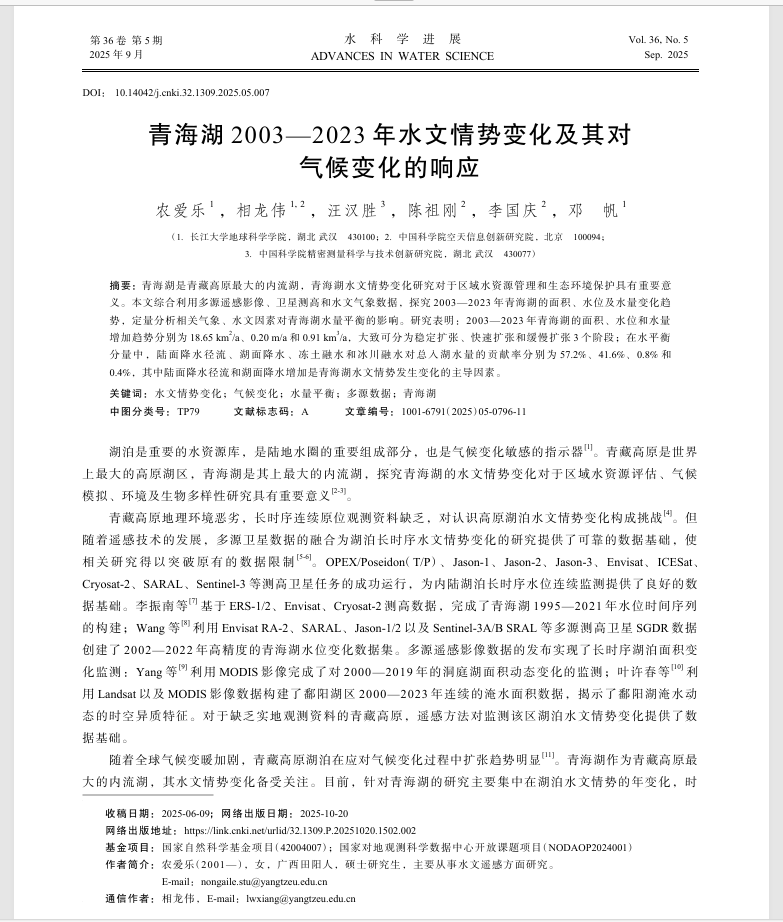 近日,yl7703永利集团23级硕士研究生农爱乐以第一作者身份在中文核心期刊《水科学进展》(IF 5.098)上发表题为“青海湖2003—2023年水文情势变化及其对气候变化的响应”的研究论文(图1)。yl7703永利集团为论文第一署名单位,其导师相龙伟为论文通讯作者。