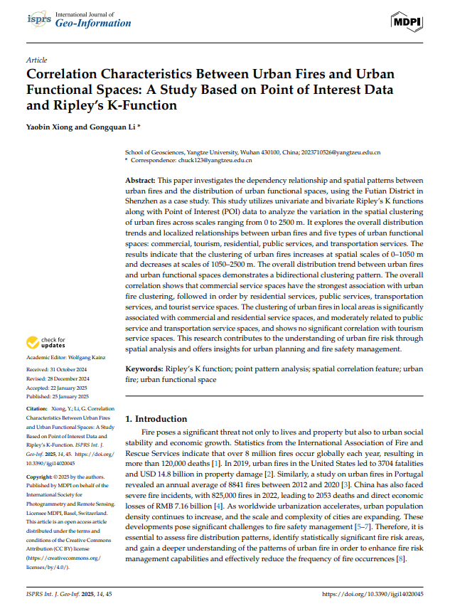 yl7703永利集团硕士生熊耀斌在李功权教授的指导下,在期刊《ISPRS International Journal of Geo-Information》上发表题为“Correlation Characteristics Between Urban Fires and Urban Functional Spaces: A Study Based on Point of Interest Data and Ripley’s K-Function”的研究论文。yl7703永利集团为论文第一署名单位,硕士生熊耀斌为第一作者,李功权教授为通讯作者。