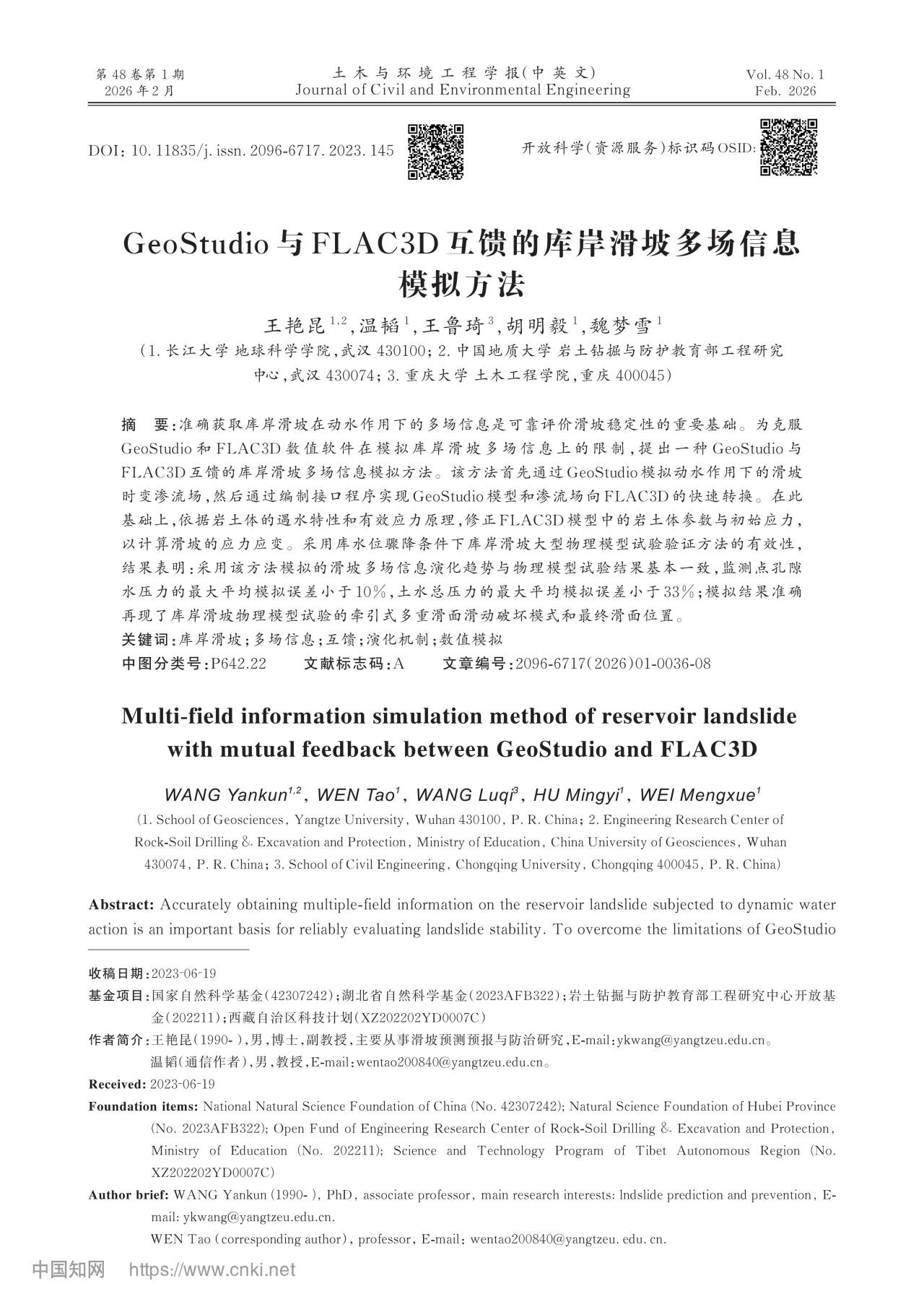 我校yl7703永利集团王艳昆副教授在北大中文核心期刊《土木与环境工程学报(中英文)》发表题为“GeoStudio与FLAC3D互馈的库岸滑坡多场信息模拟方法”的研究论文,yl7703永利集团温韬教授为第一通讯作者,yl7703永利集团为第一署名单位(图1)。