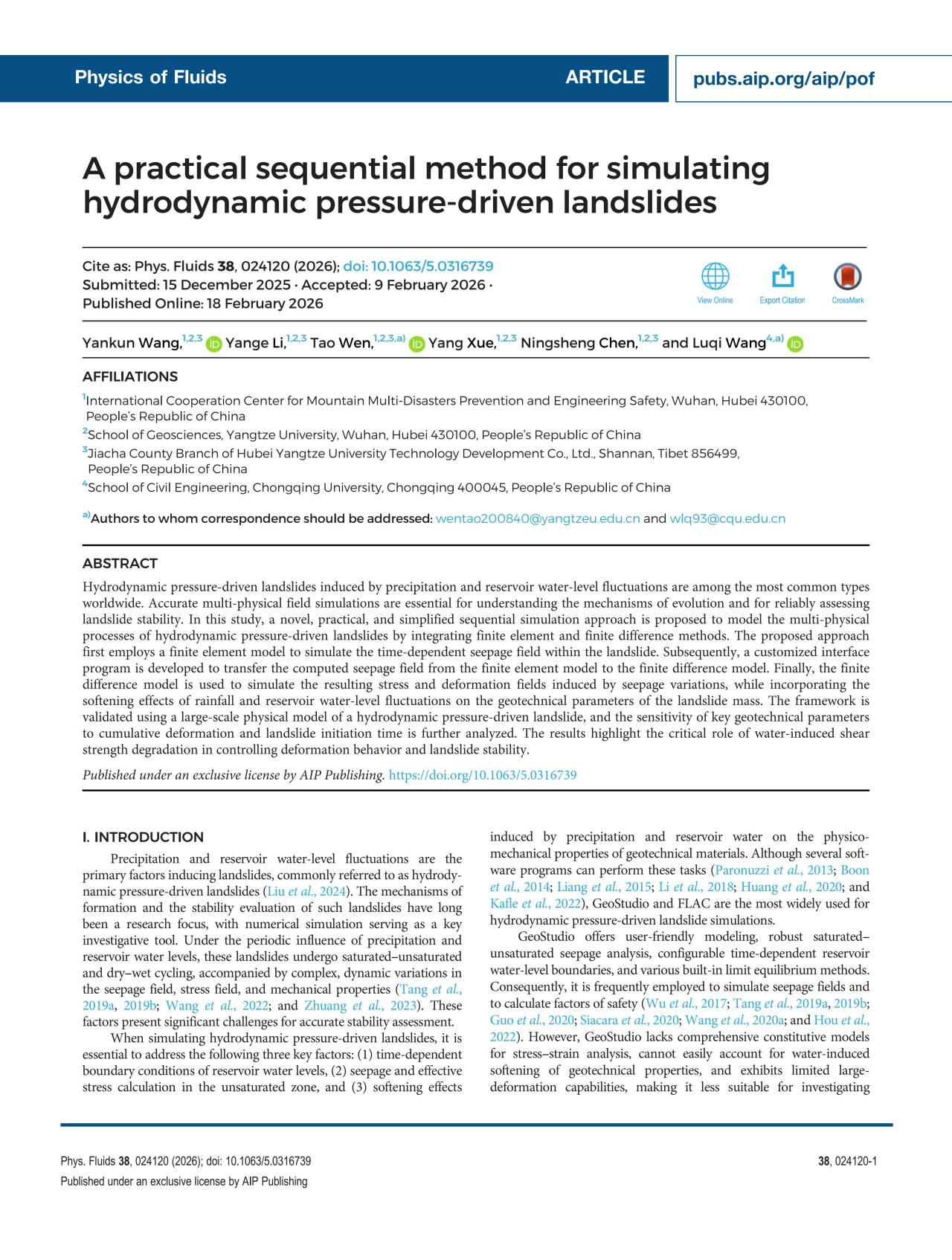 我校yl7703永利集团王艳昆副教授在中科院2区期刊《Physics of Fluids》上发表题为“A practical sequential method for simulating hydrodynamic pressure-driven landslides”的研究论文,yl7703永利集团温韬教授与重庆大学土木工程学院王鲁琦副教授为通讯作者,yl7703永利集团为第一署名单位(图1)。