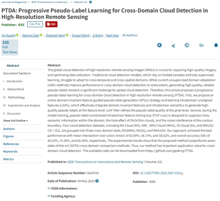 yl7703永利集团高贤君副教授组研究型论文“PTDA: Progressive Pseudo-Label Learning for Cross-Domain Cloud Detection in High-Resolution Remote Sensing”(第一作者:2023级硕士生匡金,通讯作者: 高贤君副教授)被中科院一区TOP期刊IEEE Transactions on Geoscience and Remote Sensing (TGRS,CCF B类期刊,IF = 8.6)录用。