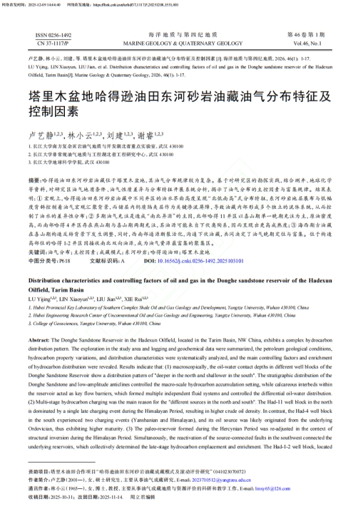 近日,我院2023级地质学硕士研究生卢艺静在中文核心期刊《海洋地质与第四纪地质》上发表题为“塔里木盆地哈得逊油田东河砂岩油藏油气分布特征及控制因素”的论文(共17页)。全部作者均为yl7703永利集团师生,研究生卢艺静为第一作者,其导师林小云教授为通讯作者,该研究揭示了塔里木盆地哈得逊油田东河砂岩油藏(下文中简称东河砂岩油藏)的油气运移路径和油气富集规律,为该地区油气勘探提供了新的理论依据。