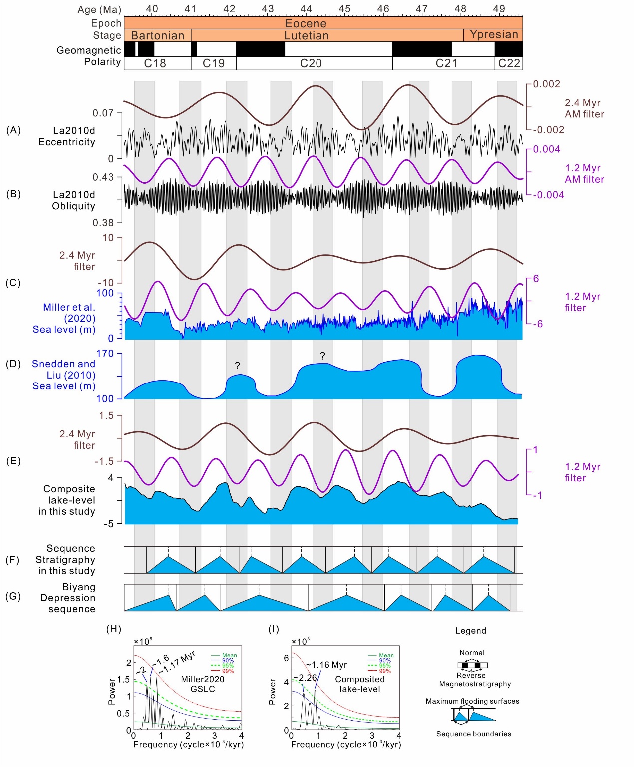 研究首次在陆相湖盆研究中应用多重因子分析方法,整合了三口钻井的沉积噪声模拟结果,构建了更能代表区域古水文状况的、可靠的复合古湖面变化曲线。同时,为该段地层建立了高精度的天文年代标尺。研究发现,重建的古湖面变化受地球轨道周期驱动,并且其在1.2百万年和2.4百万年的轨道周期上,与同期全球海平面变化记录基本同步。这一发现是在东亚陆相盆地中,从轨道尺度上将古湖面波动与全球海平面变化直接关联。研究进一步指出,东亚夏季风的变化是连接区域水文与全球水圈的关键环节。轨道尺度上季风的变化,主导了湖面与海平面变化的同步性。