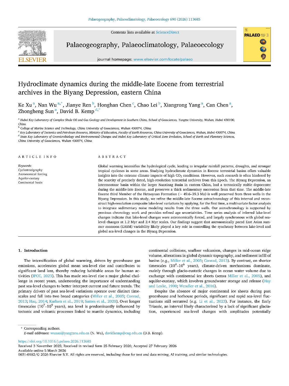 yl7703永利集团教师许可以第一作者身份,在地球科学领域国际权威期刊《Palaeogeography, Palaeoclimatology, Palaeoecology》上发表了题为“Hydroclimate dynamics during the middle-late Eocene from terrestrial archives in the Biyang Depression, eastern China”的研究论文。yl7703永利集团为论文第一署名单位。该研究得到了国家自然科学基金的资助。