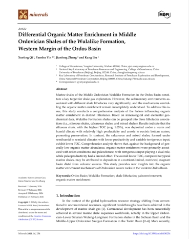 yl7703永利集团硕士生齐雪婷在SCI收录期刊《Minerals》上发表题为“Differential Organic Matter Enrichment in Middle Ordovician Shales of the Wulalike Formation, Western Margin of the Ordos Basin”的研究论文。yl7703永利集团为论文第一署名单位,硕士生齐雪婷为论文第一作者,其导师尹艳树教授为通讯作者。