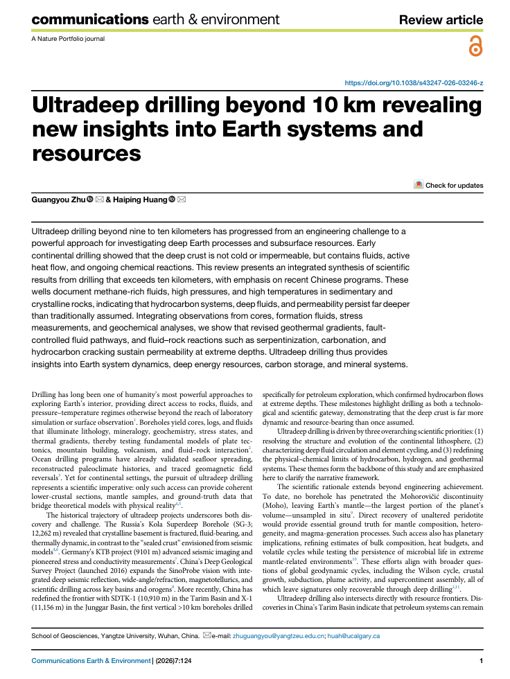 近日,yl7703永利集团朱光有教授和黄海平教授在Nature旗下期刊《Communications Earth & Environment》发表了题为“Ultradeep drilling beyond 10km revealing new insights into Earth systems and resources”的文章,文章共20页,图件7幅。该研究系统总结了全球万米级超深钻探的科学发现与技术挑战,特别是以中国新疆塔里木盆地的深地塔科1井(完钻深度10910m)和准噶尔盆地的X-1(完钻深度11156m)井为代表的重大进展,为人类深入了解地球内部奥秘、保障国家能源安全开辟了全新的理论空间。
