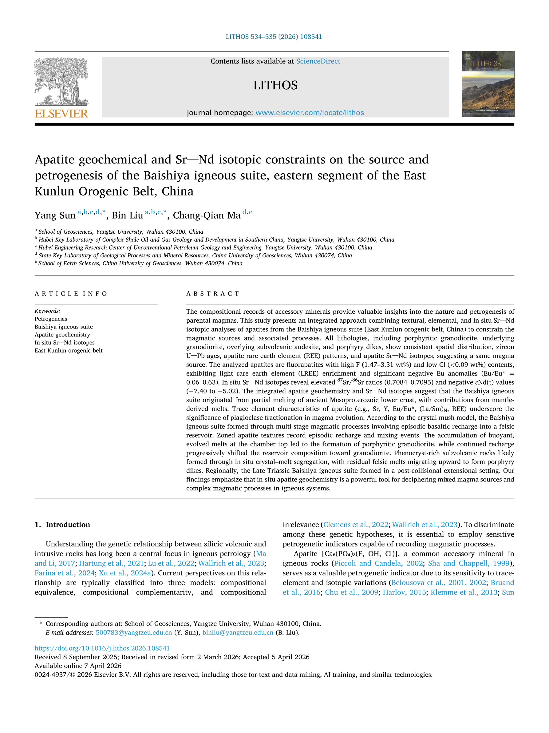 yl7703永利集团教师孙洋以第一作者兼通讯作者身份,在中科院二区TOP期刊《Lithos》上发表了题为“Apatite geochemical and Sr–Nd isotopic constraints on the source and petrogenesis of the Baishiya igneous suite, eastern segment of the East Kunlun Orogenic Belt, China”的研究论文。yl7703永利集团刘彬教授为合作通讯作者,yl7703永利集团为论文第一署名单位、通讯作者单位。该研究得到了国家自然科学基金的资助。
