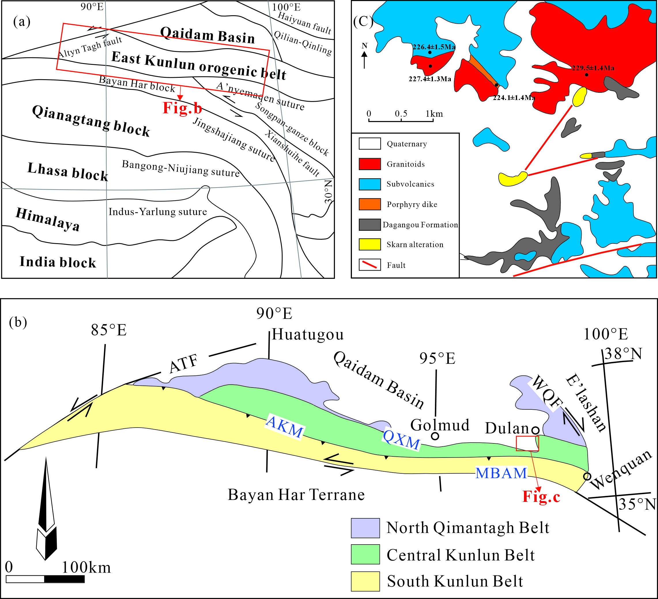 本研究以东昆仑造山带白石崖矿区出露的晚三叠世火山—侵入岩组合为研究对象(包括斑状花岗闪长岩、花岗闪长岩、英安玢岩及花岗闪长玢岩岩脉)(图2),通过开展磷灰石原位结构、主微量元素及Sr-Nd同位素综合分析,结合岩石学与全岩地球化学研究,识别不同岩性单元中磷灰石记录的晶体—熔体相互作用信息,揭示白石崖地区火山岩—侵入岩之间的成因联系及其所经历的幕式基性岩浆补给、晶体堆积与熔体抽取等多期次岩浆过程。