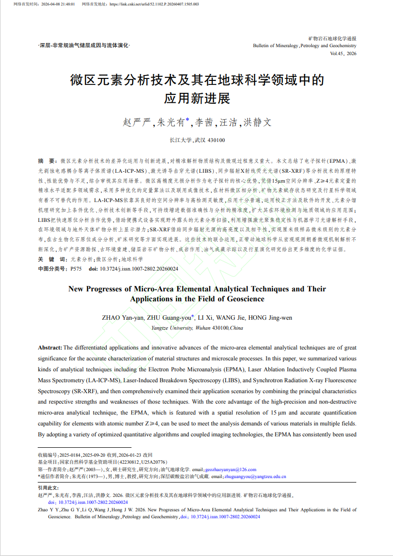 近日,yl7703永利集团硕士研究生一年级赵严严在核心期刊《矿物岩石地球化学通报》发表题为《微区元素分析技术及其在地球科学领域中的应用新进展》的论文。论文作者均为yl7703永利集团师生,其中硕士研究生赵严严为第一作者,导师朱光有教授任通讯作者。