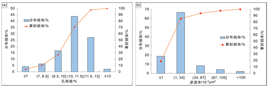 图2.W油层组孔隙度和渗透率分布频率直方图
