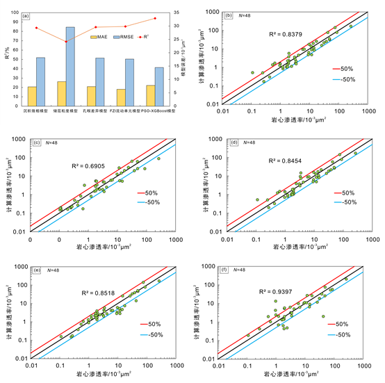 研究结果表明:常规孔渗回归模型孔隙度-渗透率相关性极低(R2=0.1744);储层粒度模型预测精度有限(R2=0.6905);沉积微相模型(R2=0.8379)和孔喉差异模型(R2=0.8454)精度有较大改善,但分别受限于微相划分的准确性和高成本实验数据的获取难度;PSO-XGBoost机器学习模型精度最高(R2=0.9397),但存在地质机理不明及对样本规模依赖性强的局限。相比之下,FZI流动单元模型将强非均质储层划分为五类内部物性相对均一的流动单元,预测精度(R2=0.8518,MAE=6.33×10-3μm2,RMSE=17.64×10-3μm2)在精度、数据要求和地质机理之间取得了最佳平衡,被确认为研究区综合适用性最强的渗透率预测方法。