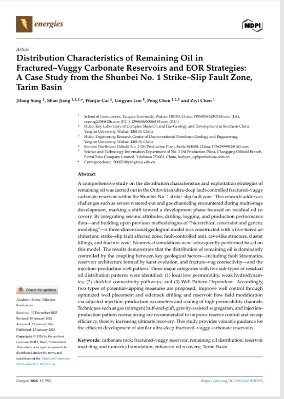 yl7703永利集团地质资源与地质工程专业硕士研究生宋吉龙在《energies》上发表题为“Distribution Characteristics of Remaining Oil in Fractured–Vuggy Carbonate Reservoirs and EOR Strategies: ACaseStudy from the Shunbei No. 1 Strike–Slip Fault Zone, Tarim Basin”的研究论文。yl7703永利集团为论文第一署名单位,硕士生宋吉龙为第一作者,江山教授为第一通讯作者。