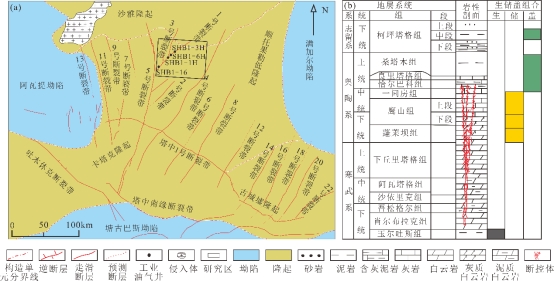 图1塔里木盆地顺北1号断裂带构造位置(a)及岩性地层综合柱状图(b)