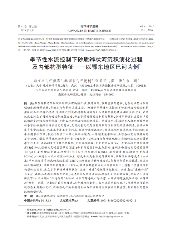 近日,yl7703永利集团硕士学生汪佩霖在冯文杰副教授指导下,以第二作者身份(导师第一作者)在期刊《地球科学进展》(2026年41卷2期)上发表题为《季节性水流控制下砂质辫状河沉积演化过程及内部构型特征——以鄂东地区巴河为例》的研究论文。该研究通过无人机倾斜摄影与探槽剖面实测相结合的方法,系统揭示了季节性水流对砂质辫状河沉积演化的控制机制,提出了“建造—改造”两阶段演化模型,为复杂河流相油气储层预测提供了新的理论依据。