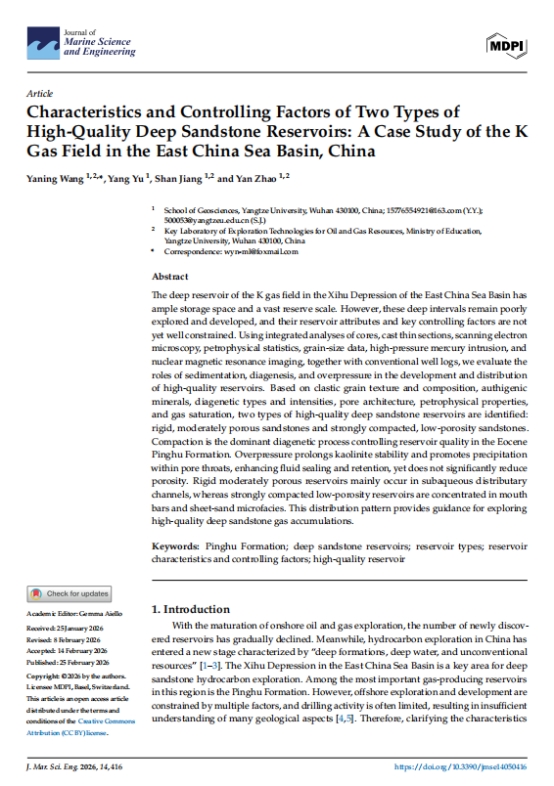 yl7703永利集团地质学专业硕士研究生于洋在SCI收录期刊《Journal of Marine Science and Engineering》上发表题为“Characteristics and Controlling Factors of Two Types of High-Quality Deep Sandstone Reservoirs: A Case Study of the K Gas Field in the East China Sea Basin, China”的研究论文。yl7703永利集团为论文第一署名单位,王雅宁副教授为第一作者。