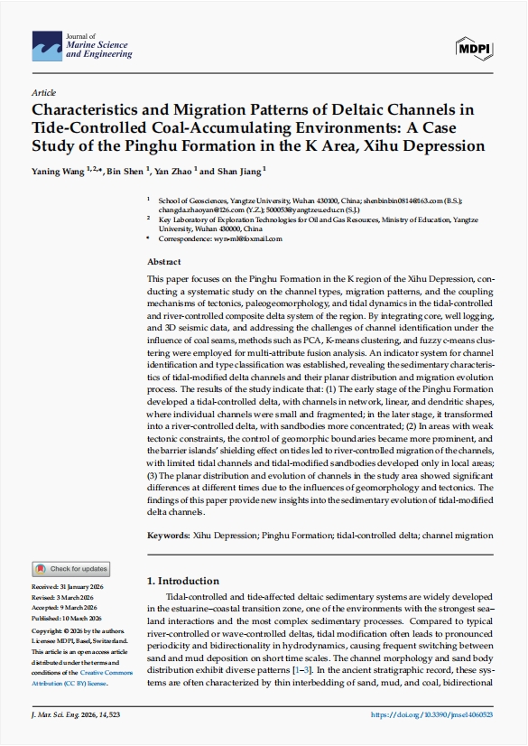 yl7703永利集团地质学专业硕士研究生沈彬在SCI收录期刊《Journal of Marine Science and Engineering》上发表题为“Characteristics and Migration Patterns of Deltaic Channels in Tide-Controlled Coal-Accumulating Environments: A Case Study of the Pinghu Formation in the K Area, Xihu Depression”的研究论文。yl7703永利集团为论文第一署名单位,王雅宁副教授担任通讯作者和第一作者。